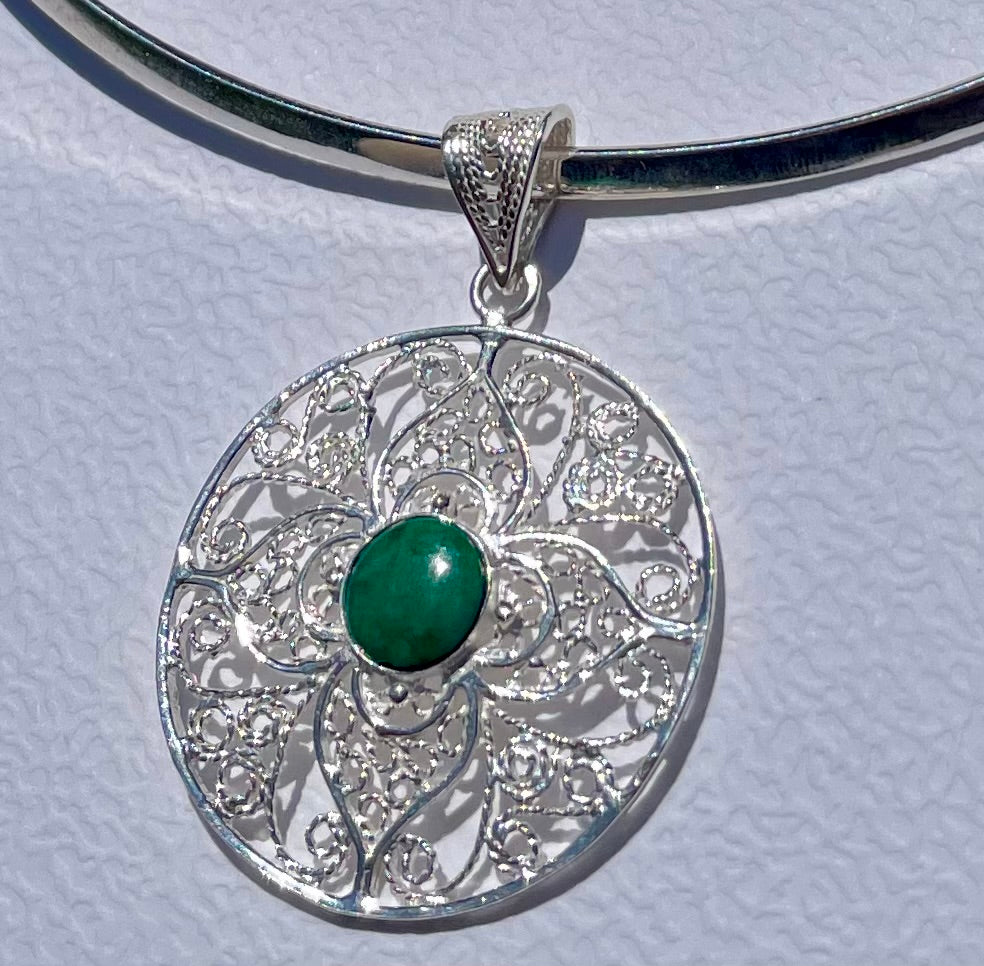 Découvrez le bijou Ana de Peru "Esperanza", un pendentif en argent orné d'une belle pierre de jade. Fabriqué à la main selon la technique du filigrane, ce bijou contemporain mettra en valeur votre élégance et votre féminité. Offrez-vous un bijou unique et raffiné pour sublimer votre style.
